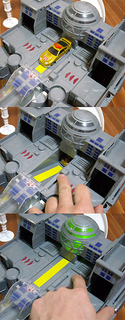 屋根部に搭載したトミカをレバーでコースにセット、「スタンバイ」のセリフとともにライトが光る。
